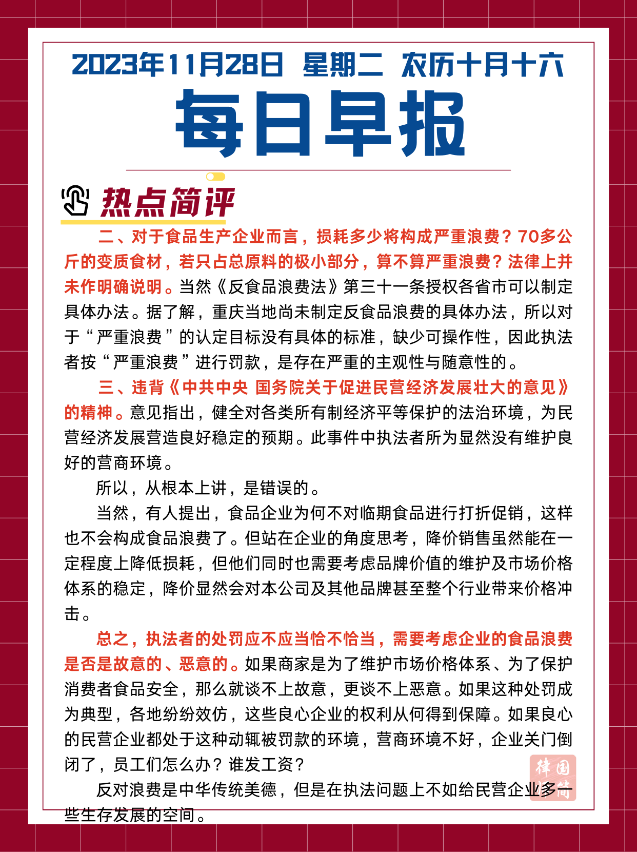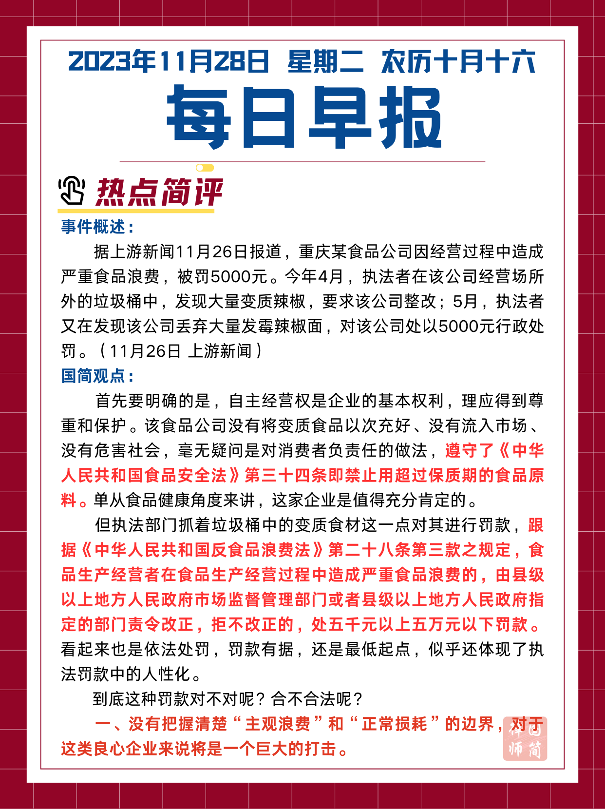 每日早报11.28|评企业丢弃变质食材被罚5000