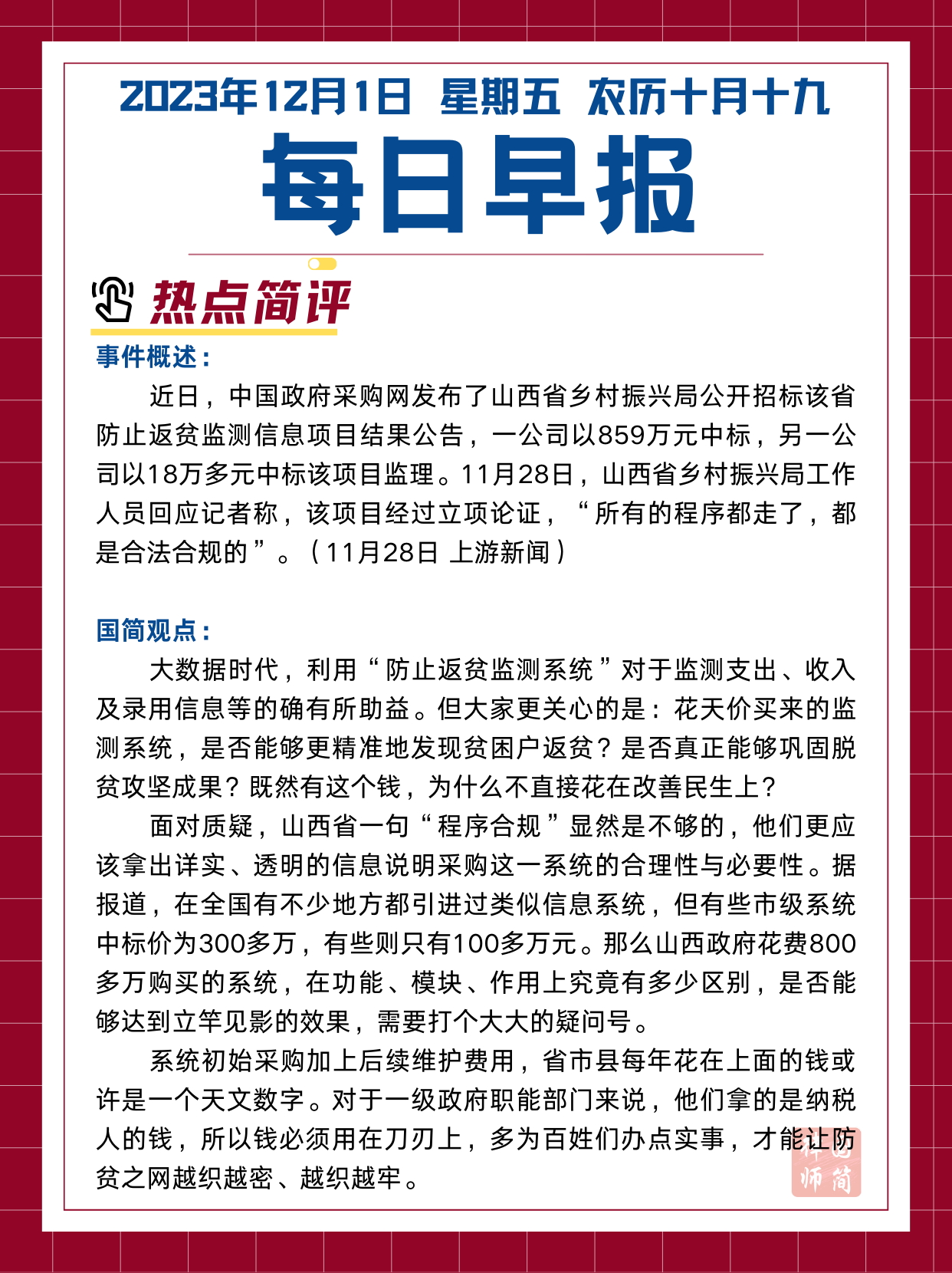 每日早报12.1|评山西花859万买防止返贫监测系统