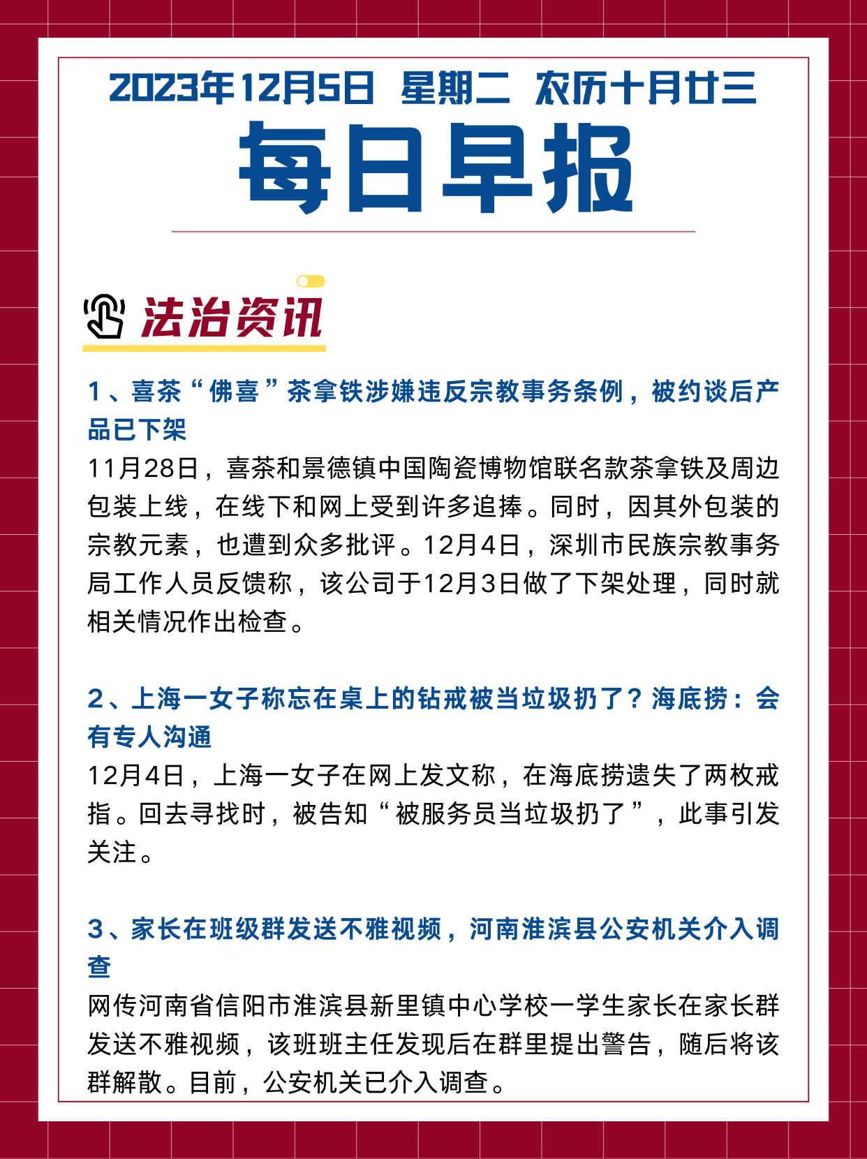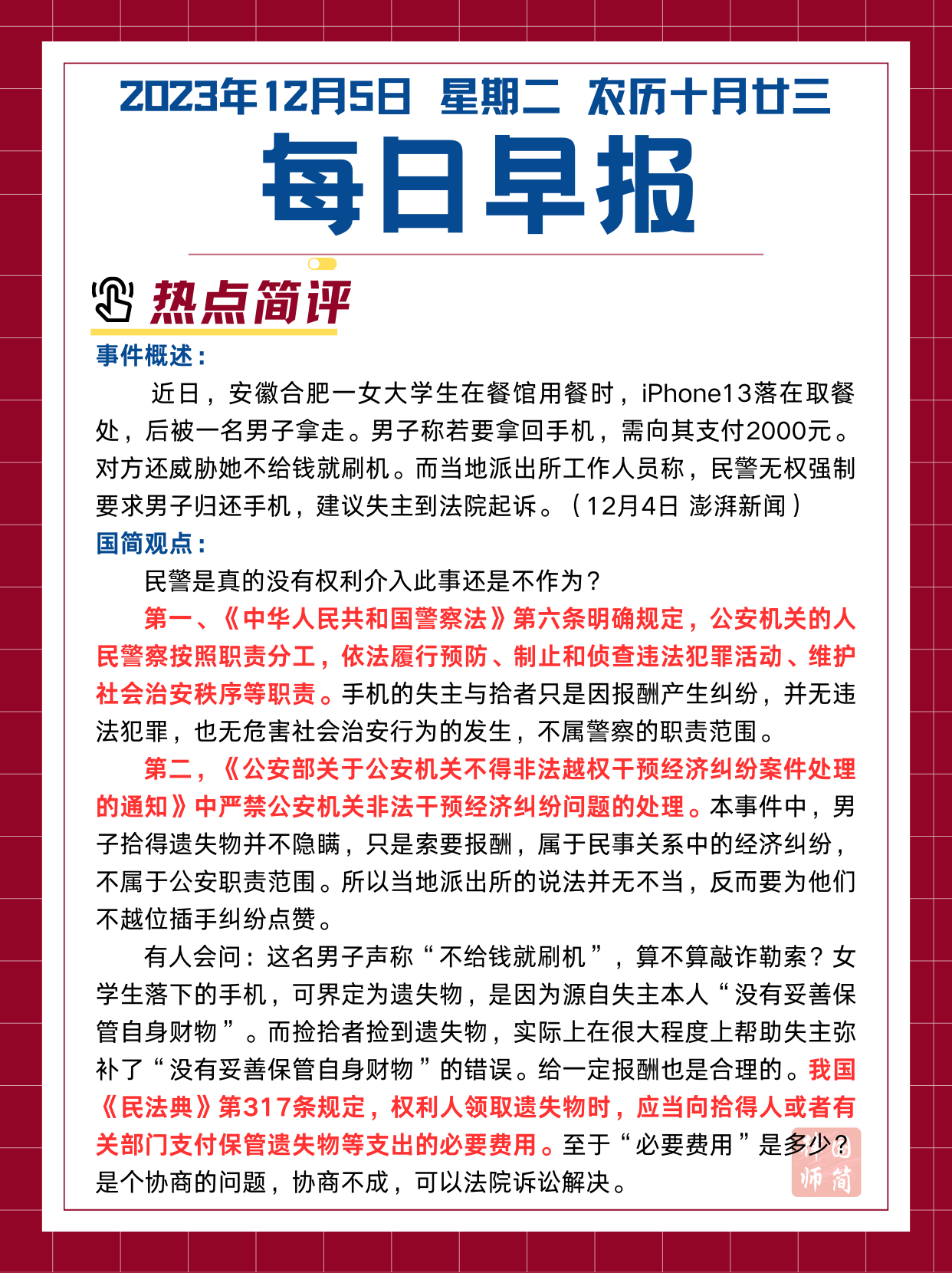 每日早报12.5|捡到手机索要两千警察能管吗