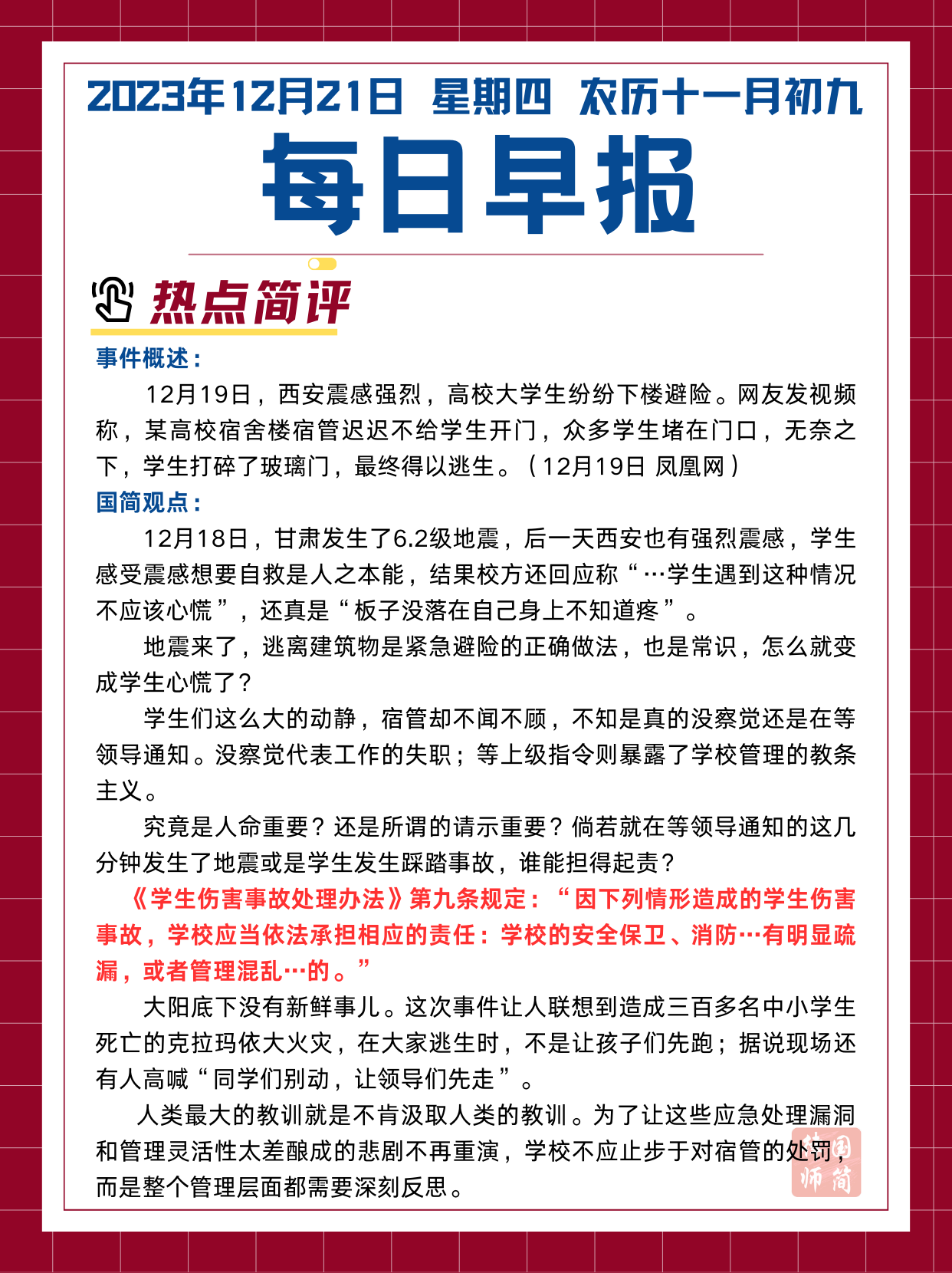 每日早报12.21|评地震时宿管不开门学生砸门逃生